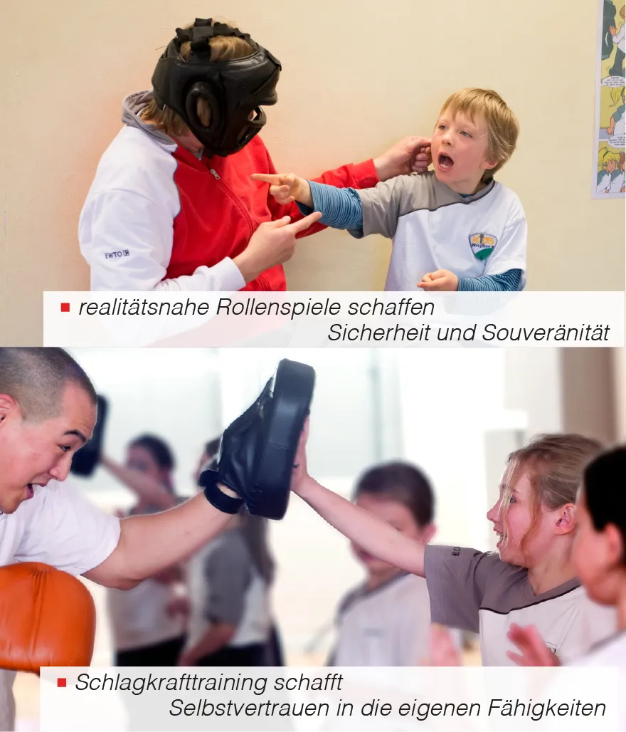 „Wie wehre ich mich? Soll ich schlagen oder nur schubsen? Wie schlage ich eigentlich richtig? Wohin soll ich schlagen? Wie wehre ich mich gegen Erwachsene?“ Wenn Prävention und Deeskalation erfolglos waren, wird es nötig, sich körperlich zu verteidigen. In Rollenspielen werden die häufigsten Angriffe nachgestellt und kindgerechte Verteidigungen eingeübt. Hierbei ist Schlagen nicht die einzige Möglichkeit. Oft reicht ein Schubsen, um eine Situation zu klären. Dies hängt von der konkreten Gefahrensituation ab: Handelt es sich um einen körperlichen Streit zwischen Kindern oder wird ein Kind von einem Erwachsenden bedrängt? Neben dem oben genannten Szenariotraining sind Koordinations-, Balance- und Konzentrationsübungen, sowie das Schlagen und Treten gegen Polster fester Bestandteil des Unterrichtes.